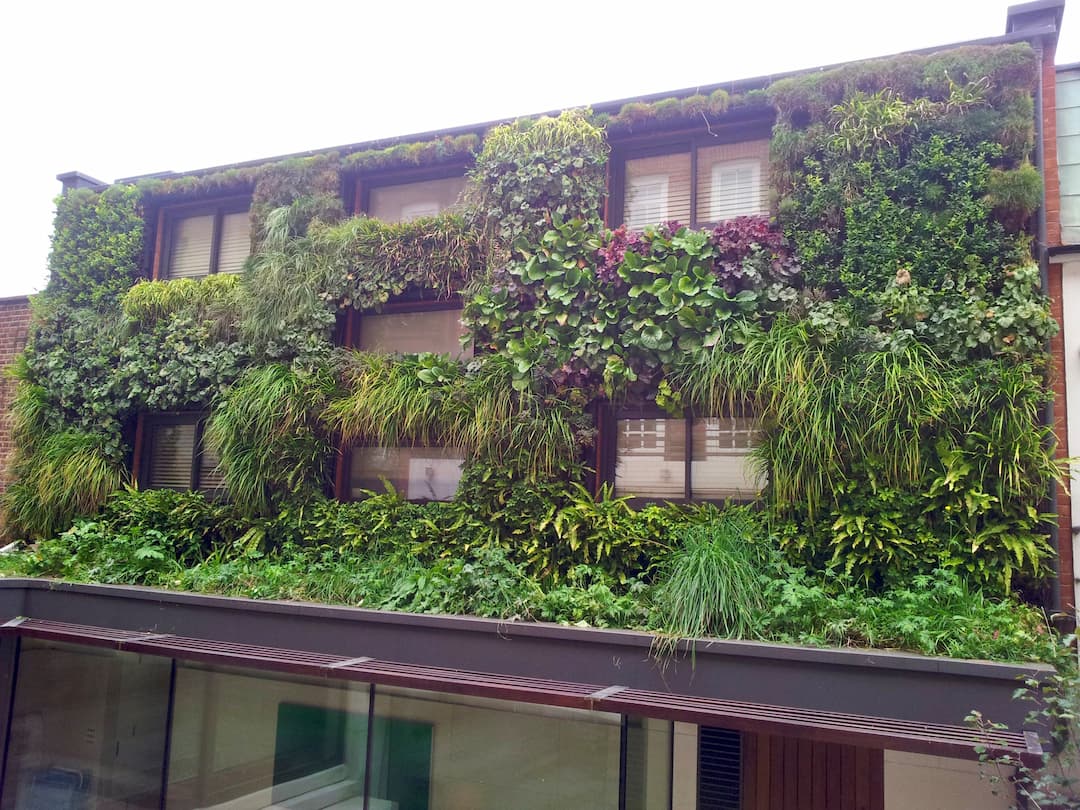 - Living Wall Systems: Modular systems where plants grow in panels or pockets, typically with integrated irrigation. (Image Modular system, Lonsdale Road, London)